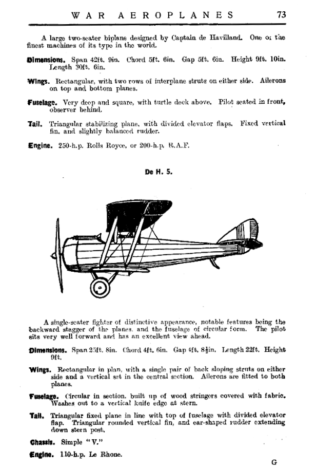 While examining the various returns from The Flying Book, in the section entitled War Aeroplanes we can see a full page description including a line drawing of the De H 5 that allows us to understand something of the admiration in which the aircraft designed by Geoffrey De Havilland were held at that time. The publication describes the aircraft as “A large two-seater biplane designed by Captain de Havilland. One of the finest machines of its type in the world.”
