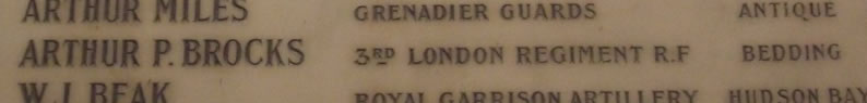 Adjacent to Brocks on the memorial is Arthur Miles. Arthur George Miles form Betchworth in Surry was working in the antiques department at the Harrods store when he joined army. Newly married to Maud, in the 1911 Census (available at TheGenealogist) his occupation was furniture porter and the couple were living in Chelsea.