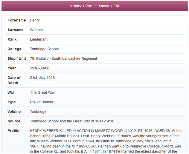 From the Profile section we learn that Henry was killed in action in Mametz Wood on 21 July. It reveals that he was from Horley and the dates when he was at Tonbridge School. Also detailed is that he was the youngest son of a doctor, the late William Webber MD, and was born in 1849. After school he went up to Pembroke College, Oxford and took his BA in 1871. In 1874 he married the eldest daughter of the late Norman Morris, of Ford Manor, Lingfield, Surrey, and when he entered the Stock Exchange he became a member of his father-in-law’s firm, Norman Morris & Co.