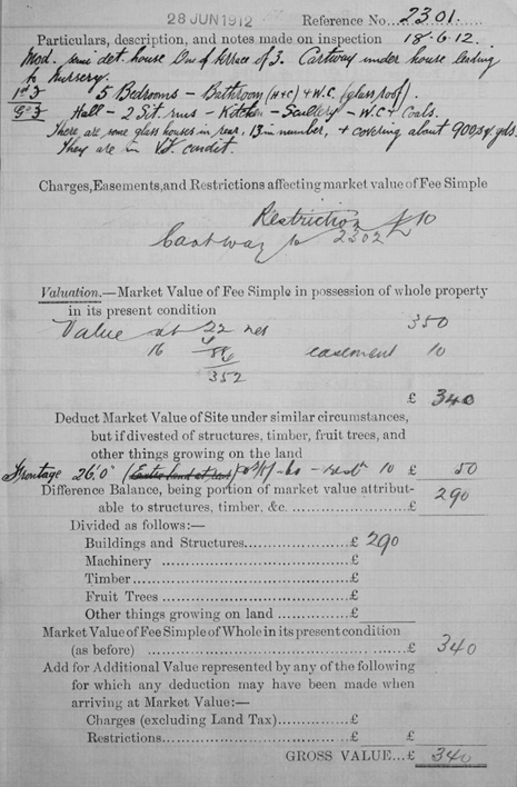 In the 1911 census a railway guard on the Great Northern Railway named Michael Sharman lived with his wife, Edith, at a property called ‘Kirton’ in Margaret Road, New Barnet. By using the 1910 Lloyd George Domesday Survey on TheGenealogist we can now find the exact plot that corresponds with his terraced house ‘Kirton’ and see that it was just a stone’s throw from the railway station at the end of the road – presumably making it easy for him to get to work. From the field book we can see if an occupier rented his house, who the owner was and the property’s rateable value. Other details can tell us about the state of the property, the number and types of rooms such as whether they had a scullery, laundry and for wealthier properties if they had billiard rooms, libraries and servants halls. Where there are out buildings these will be identified and may give a clue as to an ancestor’s livelihood, such as in the example above where a plant nursery was operated behind the house with a cart way under part of the house.