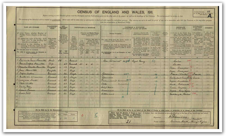 Turning to the 1852 Clergy List, which can be found within ‘Occupational Records’ on TheGenealogist, we find that the Reverend J Coldham was appointed to the living in 1816 – and his patron was none other than his brother, H Coldham Esq. A further record, also returned in the search, is the ‘Index Ecclesiasticus 1800-1840.’ Rather confusingly, this reveals that John Coldham was appointed rector of Anmer in October 1815; then vicar of Snettisham in November the same year. He then became rector of Stockton in April 1816 and then rector of Anmer again in June 1816. From the detail provided in the parish registers of Snettisham, it seems that John held more than one appointment at a time. The parish registers record the reverend’s death; the image of the original page shows that he died, aged 87, whilst living at Snettisham Vicarage, having been the vicar of the parish for 63 years. This was a period of time that included him leasing the parish glebe land to his brother, Henry. In the next census after its royal purchase, Anmer Hall is recorded as having just two occupants. In the 1901 census, there is an ‘Ordinary Agricultural Labourer’ listed as head of the household and his wife is the second resident, recorded as being Anmer Hall’s caretaker. However, by the time of the 1911 census, Anmer Hall was now occupied by the household of Rear-Admiral Sir Frederick Tower Hamilton had been a torpedo specialist and, at one time, Aide-de-Camp to the King, between 1096 and 1907. With the outbreak of World War 1, he was the second Sea Lord and Chief of Naval Staff, and in 1916, he was promoted to Admiral.